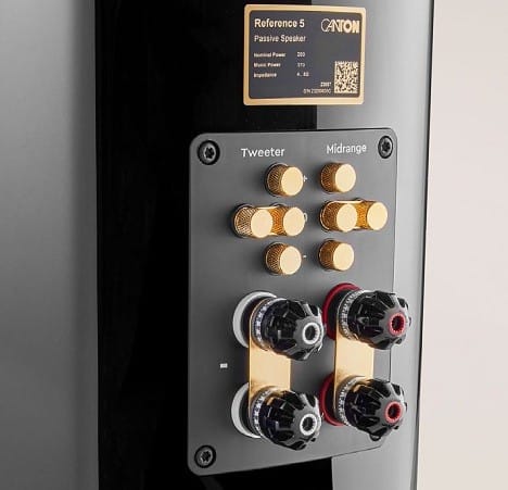 The crossover was built separately for each frequency range. According to chief developer Frank Göbl, it was optimized for timing accuracy. Interestingly, this approach seems to be finding more and more followers, instead of the usually more technically rustic solution with staggered baffles or movable units of low-mid-high-frequency systems. Additionally, in the Canton Reference 5, the bass frequencies below the useful frequency of about 35 hertz are filtered out, which reduces distortions and increases the possible maximum sound pressure. It is to be expected that top-quality components are used and high-quality cabling is employed. Very pleasant and practical is also that the levels in the mid and high-frequency ranges can be sensitively adjusted in three steps each. Whether the WBT Nextgen terminal in bi-wiring version for connecting the speaker cables is really a must-have on the equipment list is up to each proud owner to decide.