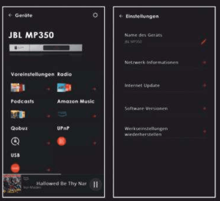 The “JBL Premium Audio” app performed excellently in the test. Its functions are largely self-explanatory. In no time, I had connected the MP350 with the Amazon Music account. Access to our music server in the listening room worked immediately. The 20,000 songs on the NAS were selectable in the app in no time. The search also worked great. An impressive performance.