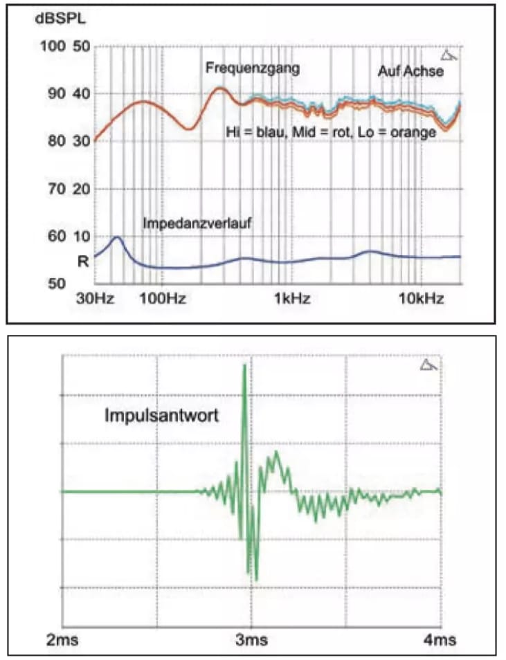 A well-balanced speaker with high efficiency (88 dB @ 2.83V/1m/1kHz) and good dispersion characteristics. It has a gentle, linearized impedance, good but not entirely resonance-free transient response, and low distortion.