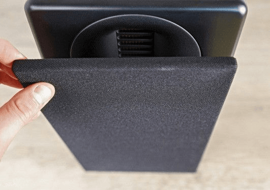 The grille attaches elegantly with magnets to the slightly slanted baffle.